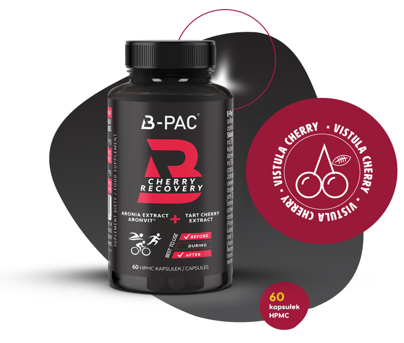 B-PAC® Cherry Recovery to suplement diety będący źródłem polifenoli i antocyjanów, przeznaczony dla sportowców i osób aktywnych fizycznie. Zawiera podwójnie standaryzowane ekstrakty z owoców cierpkiej wiśni i aronii.